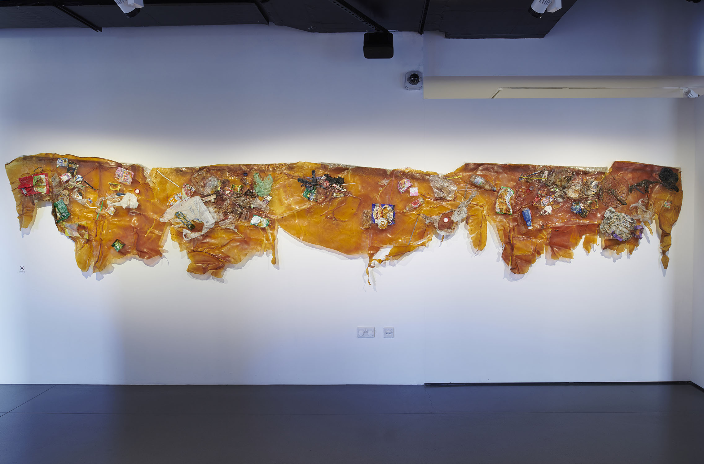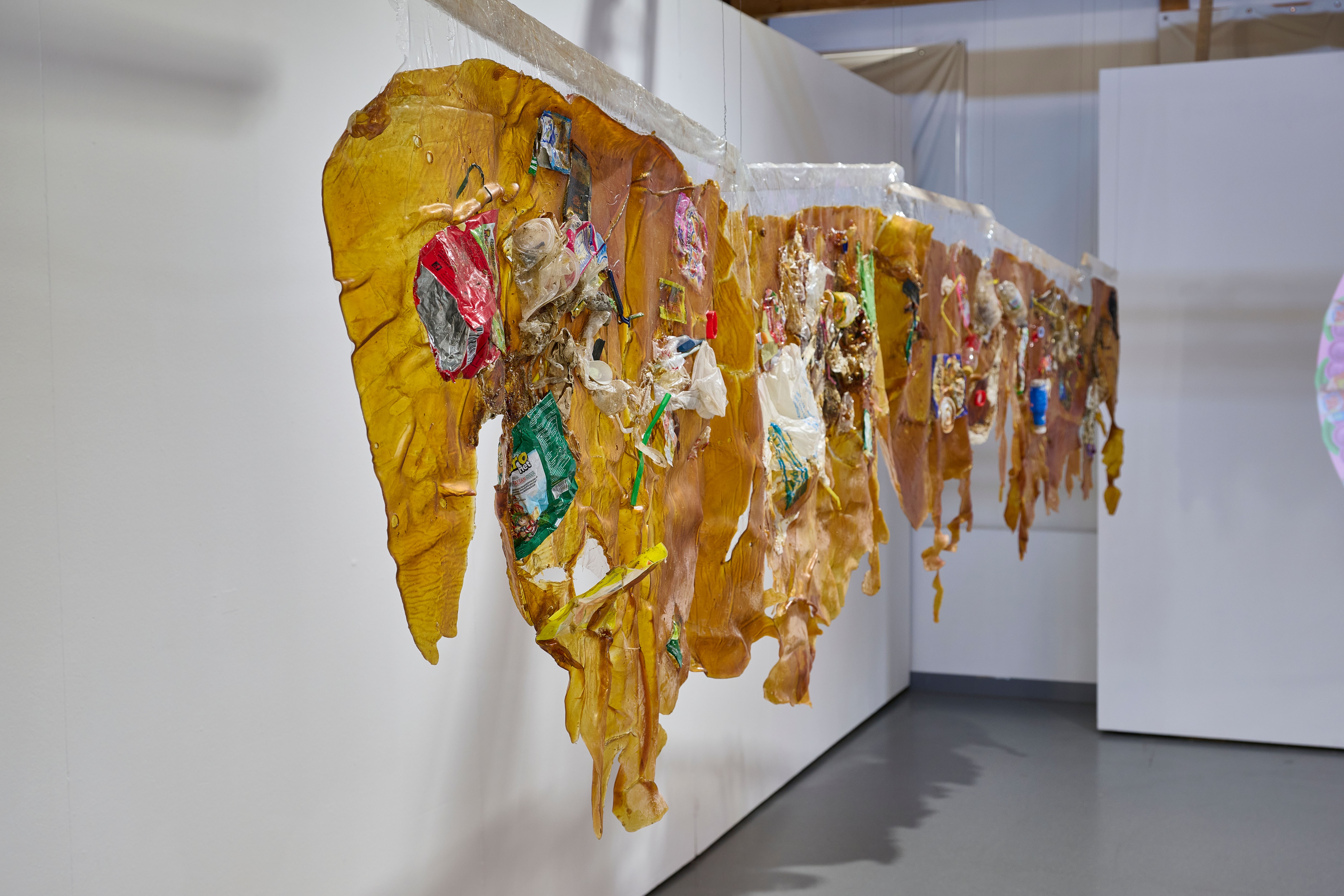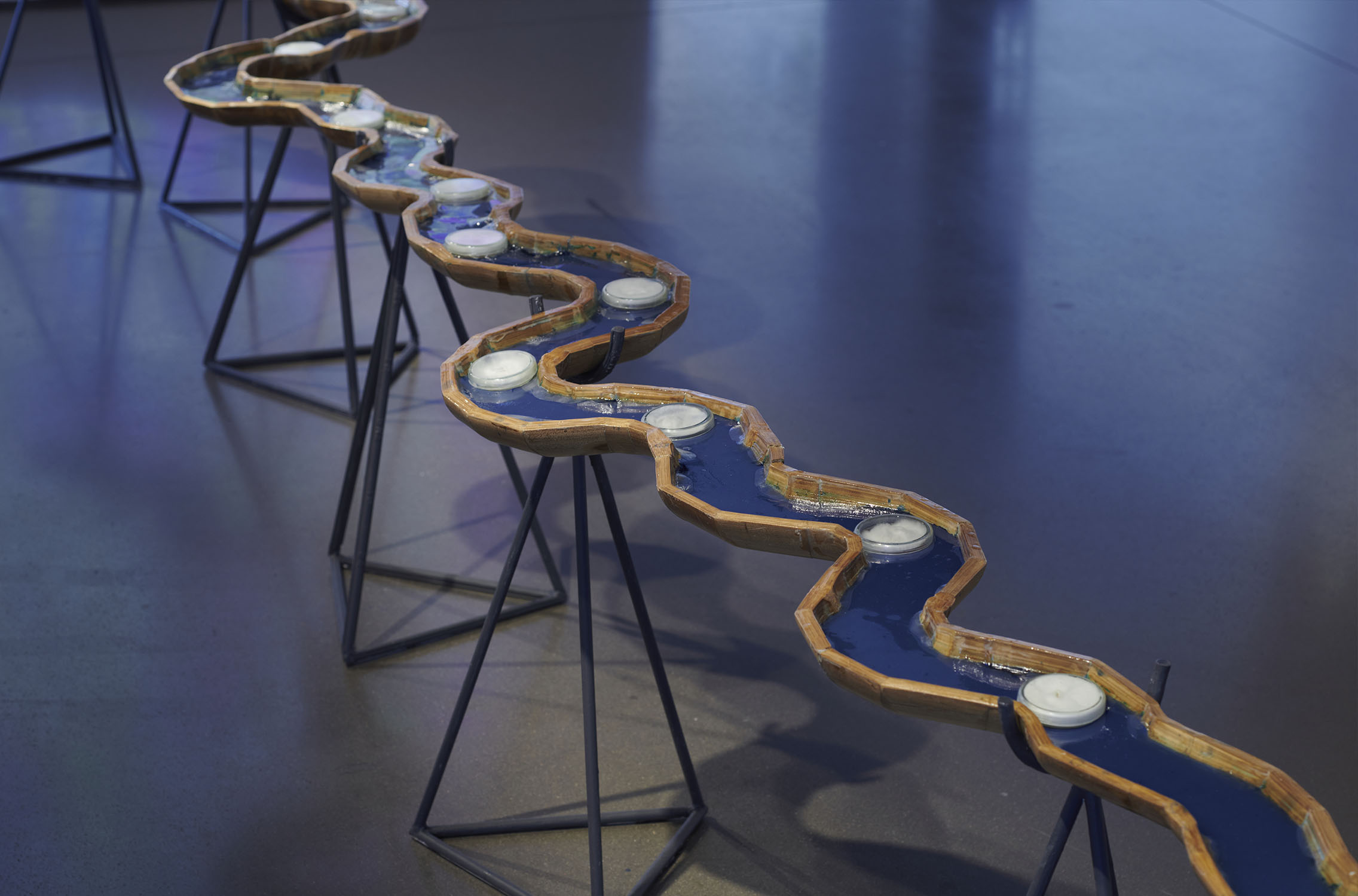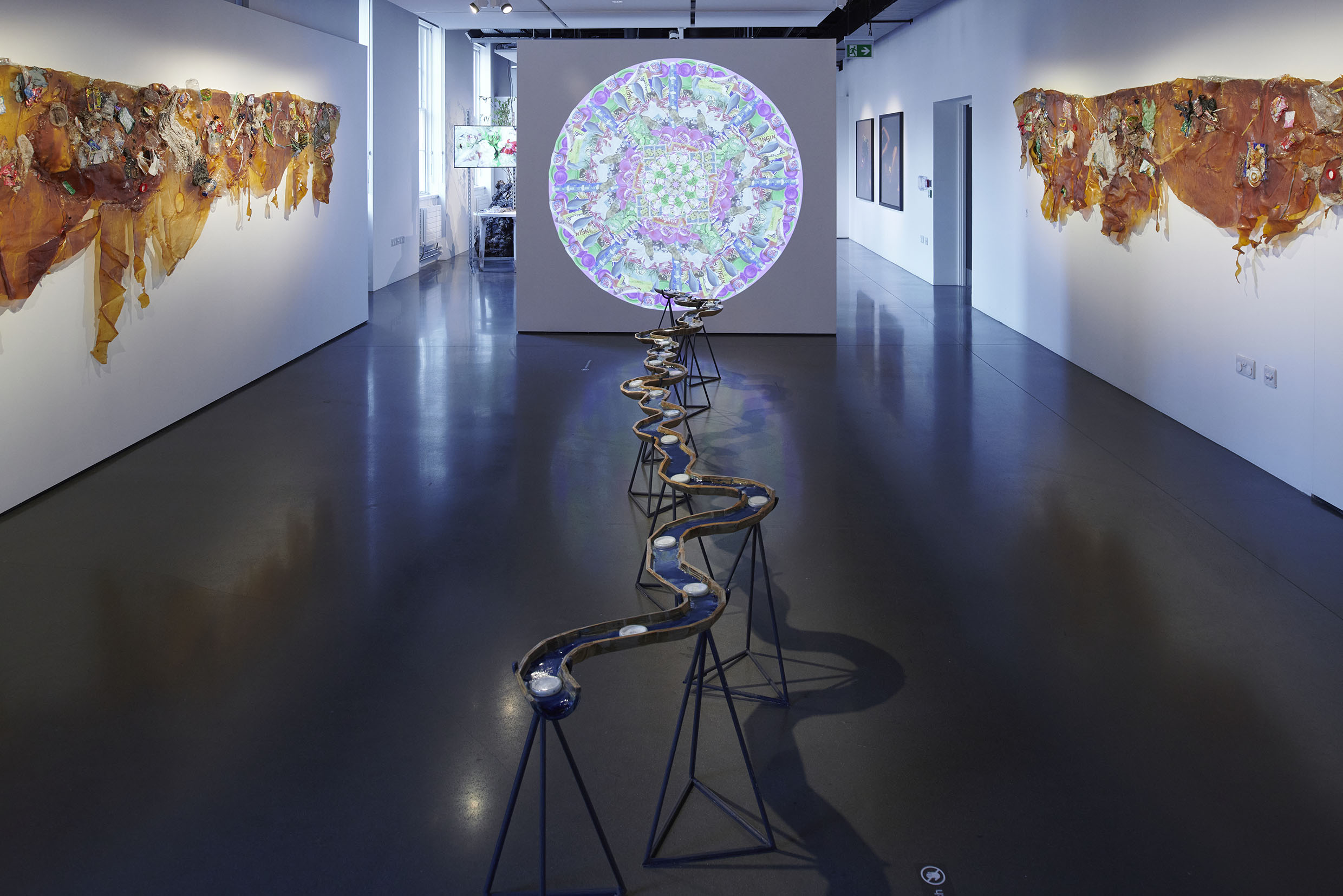 The installation includes a rotating mandala projection comprised on trash found in the river, symbolizing the constant recombination of plastic particles inside our own bodies. The installation also includes a bamboo sculpture of River Code filled with blue agar that invites microbial contamination juxtaposed against contained samples of bioremediating fungi. Next, the river is flanked by a set of two latex sculptures embodying the porosity of skin as it is embedded with trash from the river. And lastly, the installation plays a child's recording of the story "Bagaimana Dunia Berhenti Bergerak" or "How the World Stopped Moving," a story about the river who speaks to a little girl and tells her it is hurting because it cannot digest all the plastic, so it must return it all to humanity.