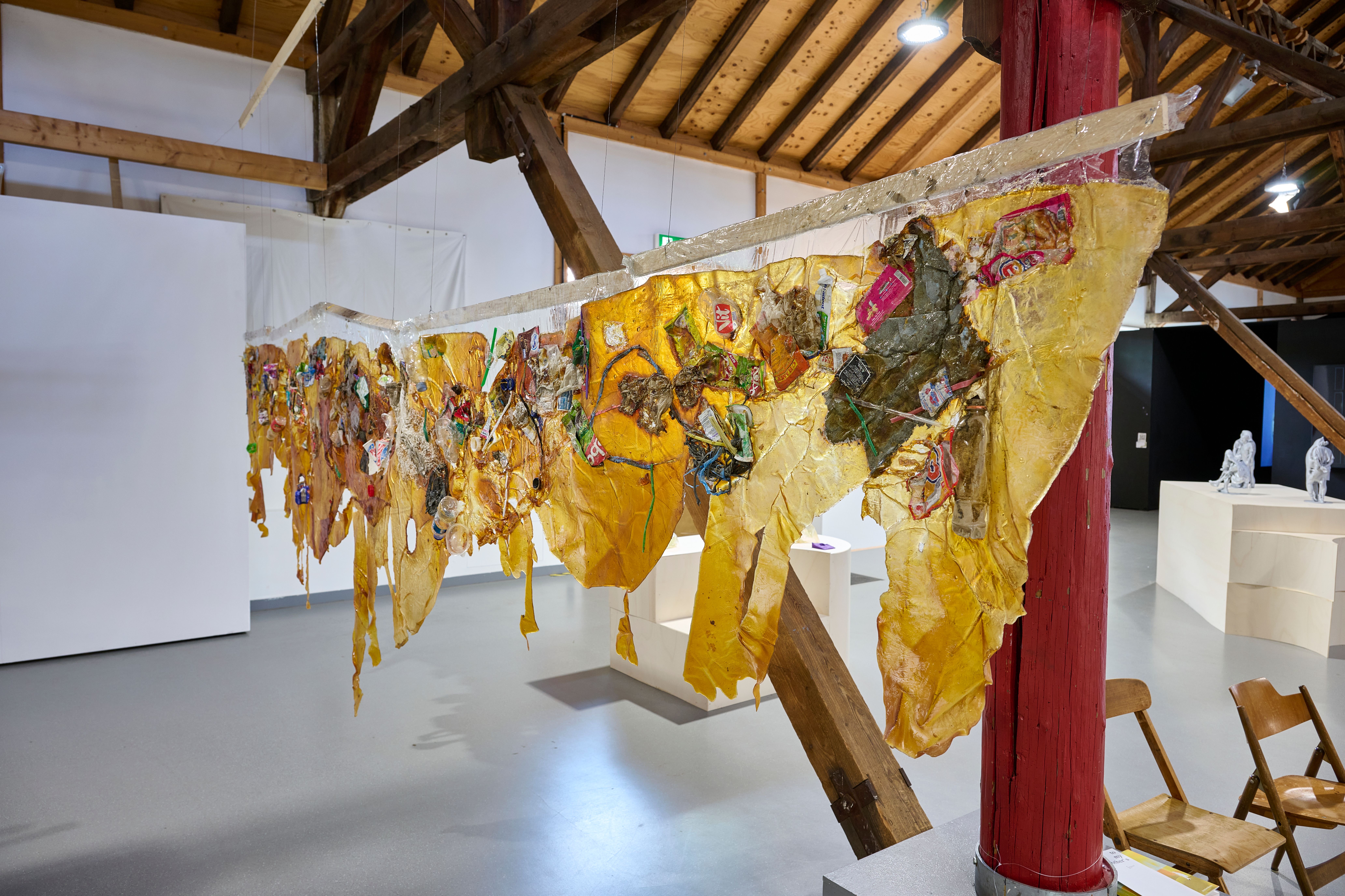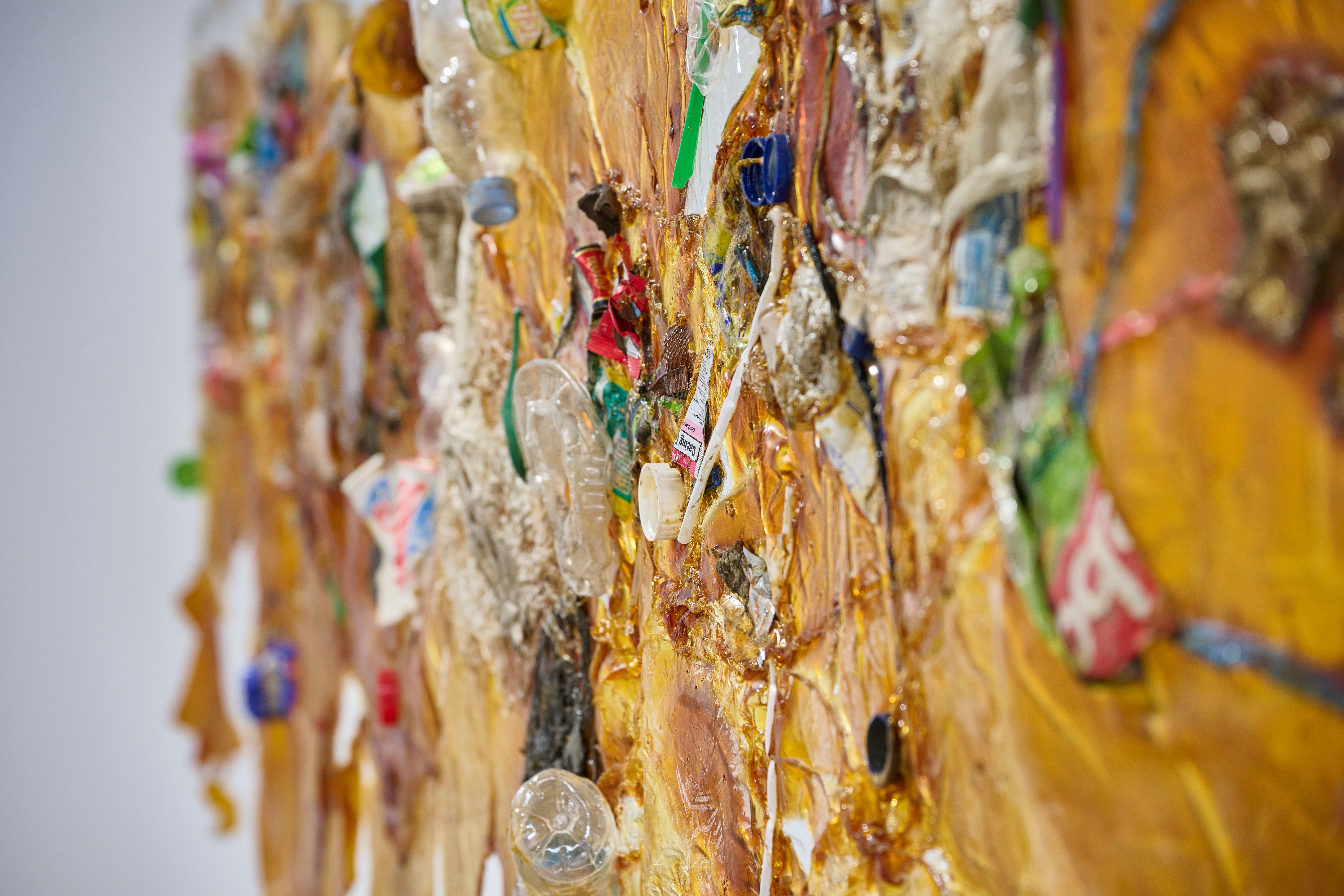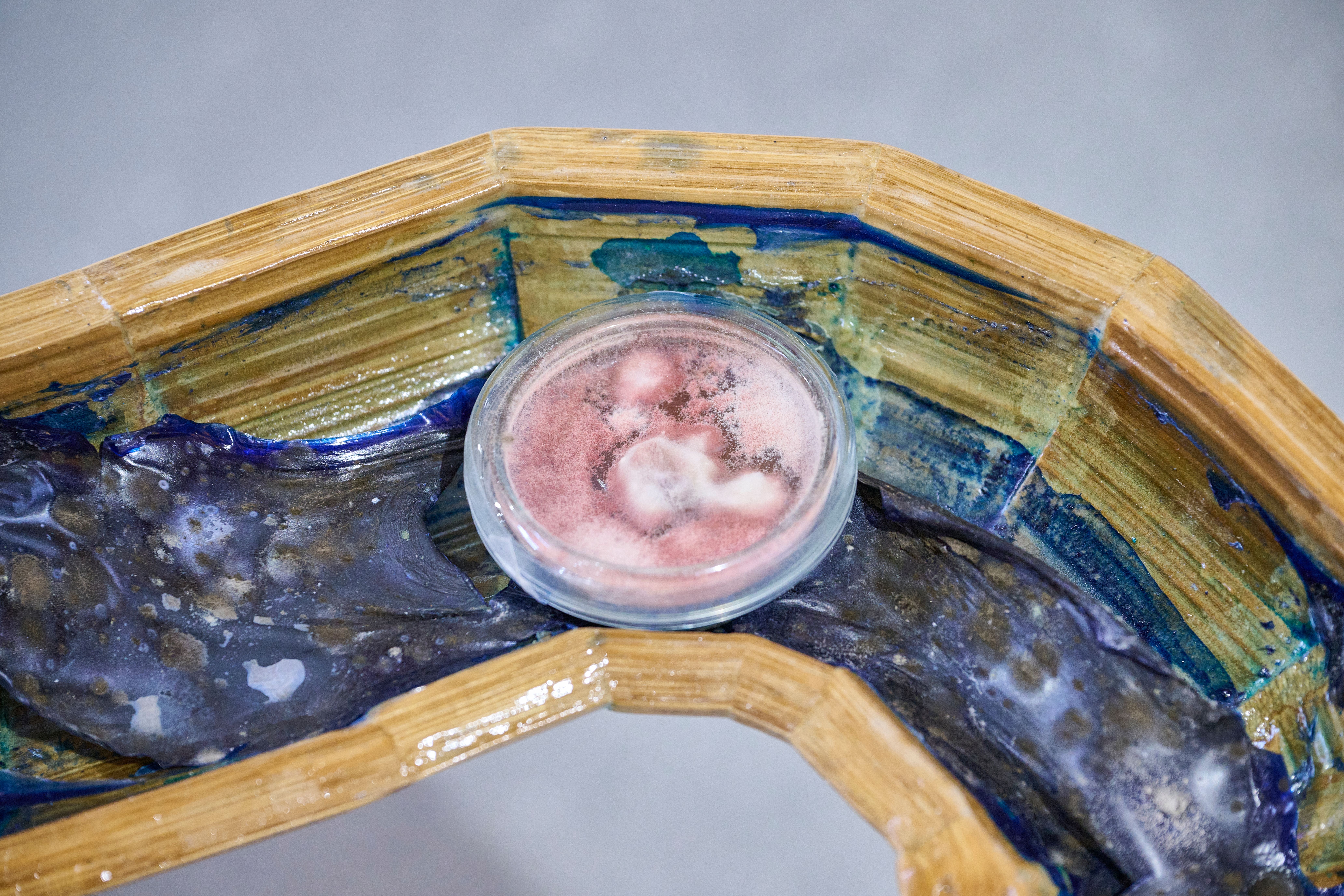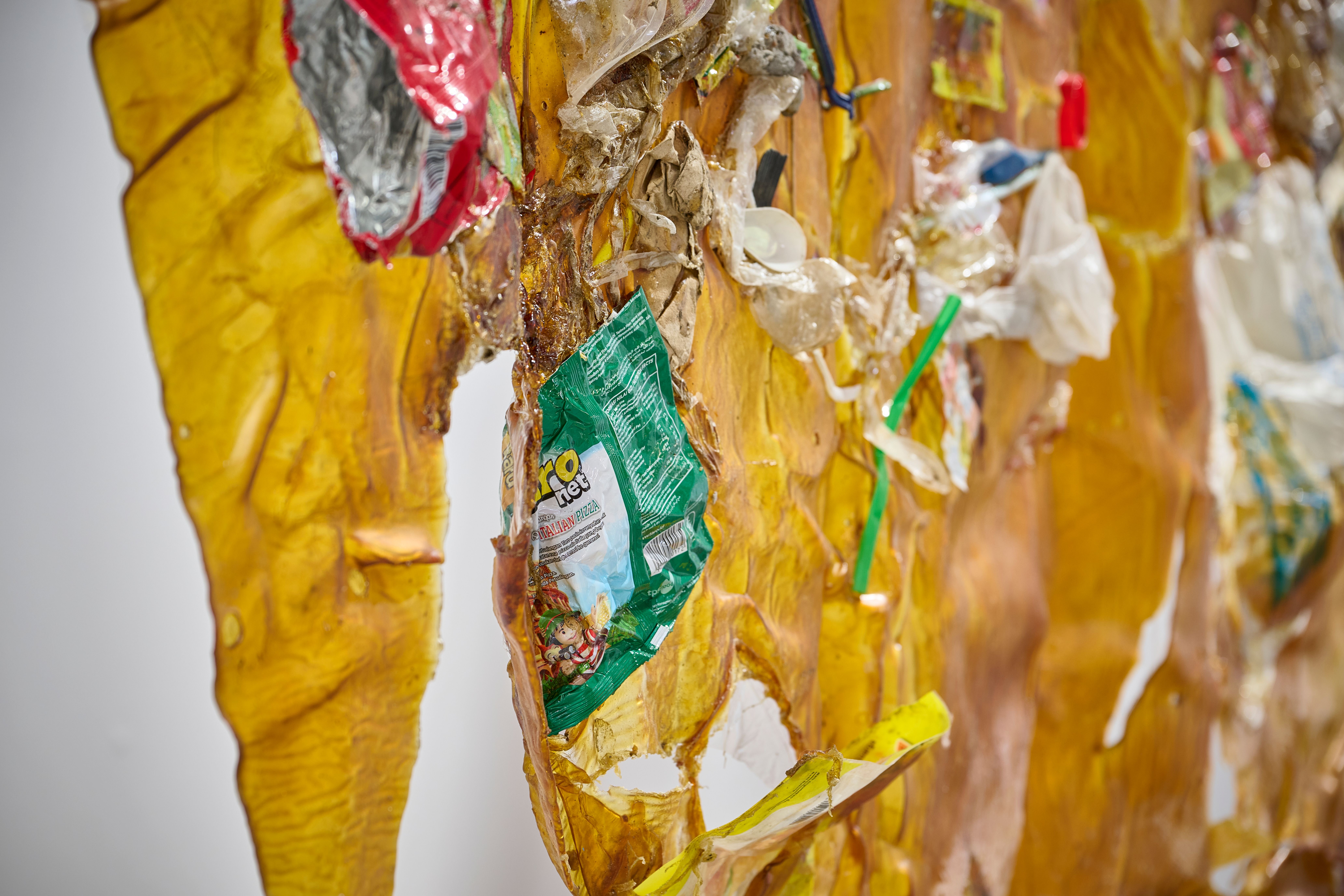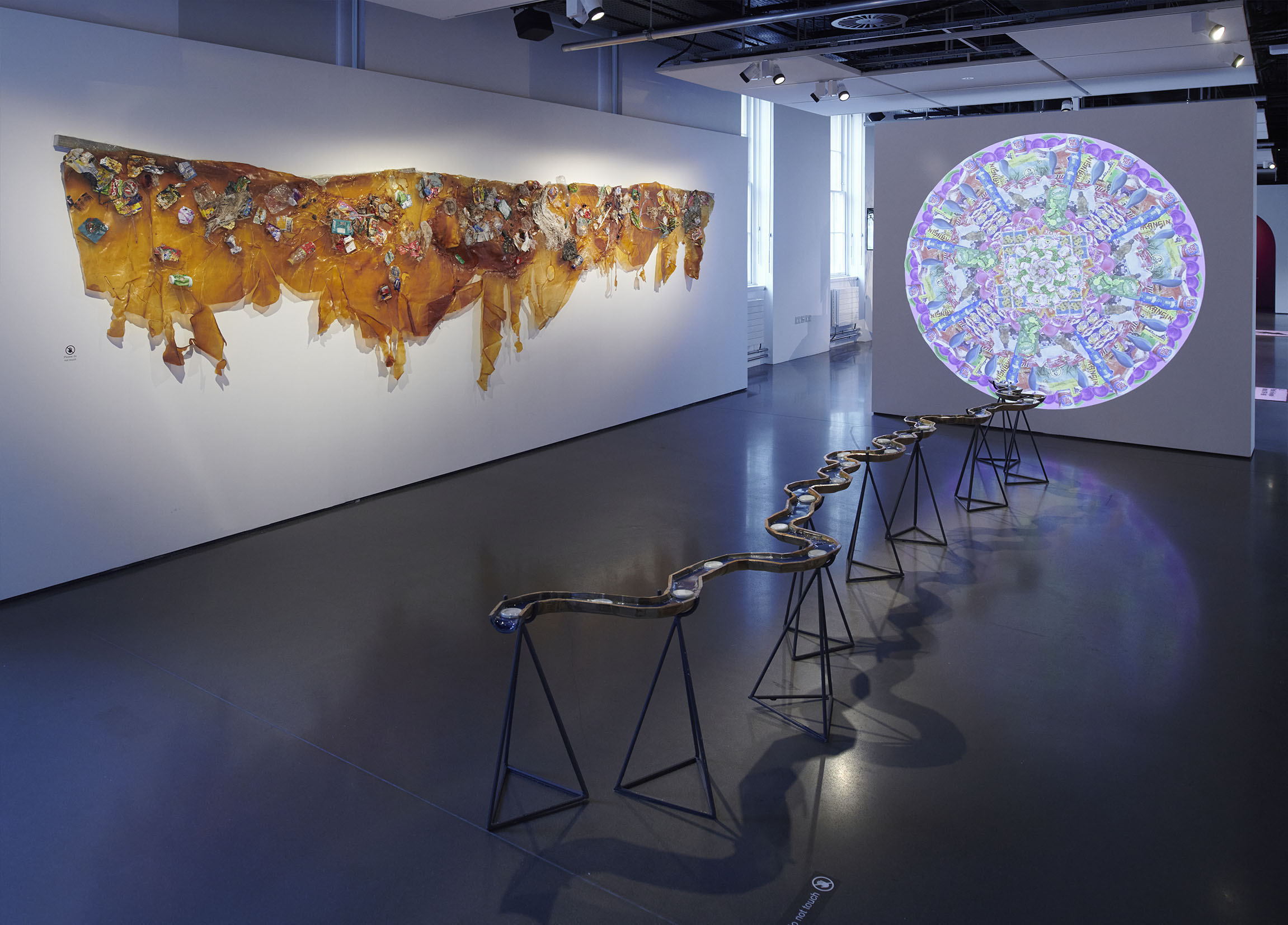 The installation includes a rotating mandala projection comprised on trash found in the river, symbolizing the constant recombination of plastic particles inside our own bodies. The installation also includes a bamboo sculpture of River Code filled with blue agar that invites microbial contamination juxtaposed against contained samples of bioremediating fungi. Next, the river is flanked by a set of two latex sculptures embodying the porosity of skin as it is embedded with trash from the river. And lastly, the installation plays a child's recording of the story "Bagaimana Dunia Berhenti Bergerak" or "How the World Stopped Moving," a story about the river who speaks to a little girl and tells her it is hurting because it cannot digest all the plastic, so it must return it all to humanity.